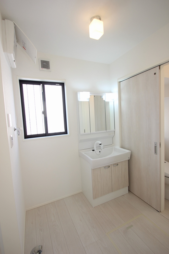 洗面所はこんな感じで脱衣スペースも兼ねておりますので大分広めにとられております