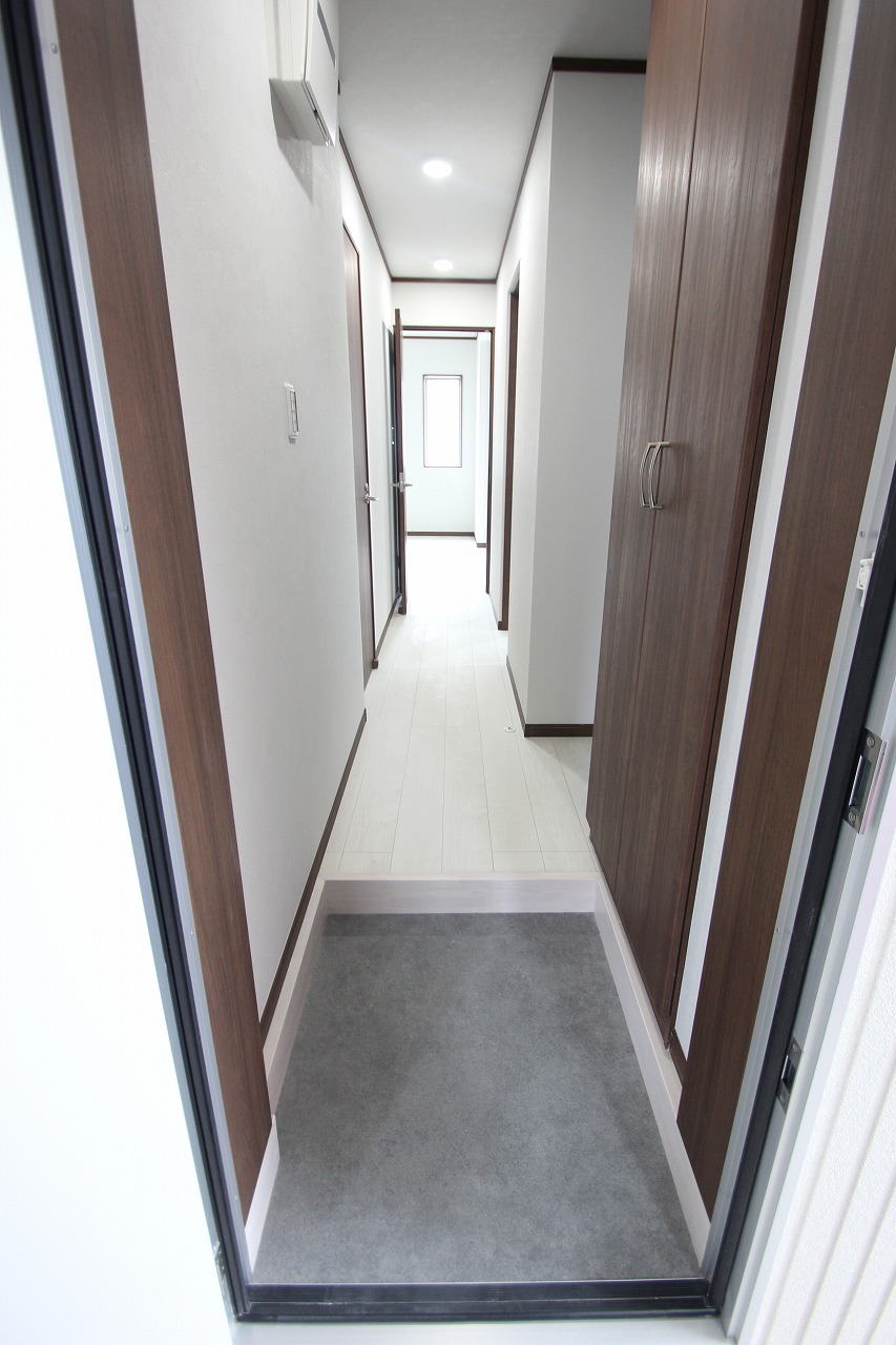 玄関を開けるとこんな感じで全体的にシックな色合いでまとめ上げられており、個人的には非常にオシャレに感じる内装仕上げとなっております