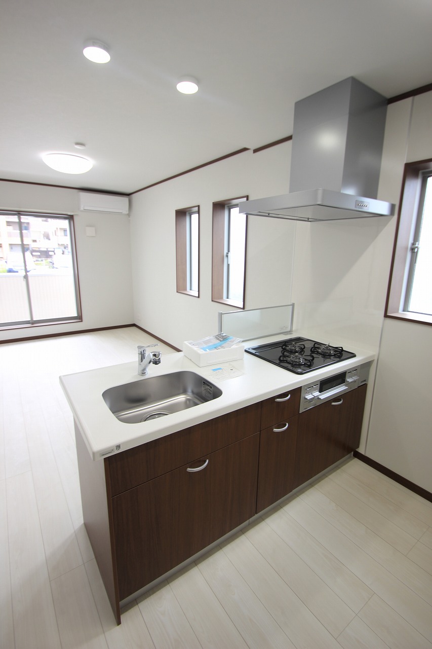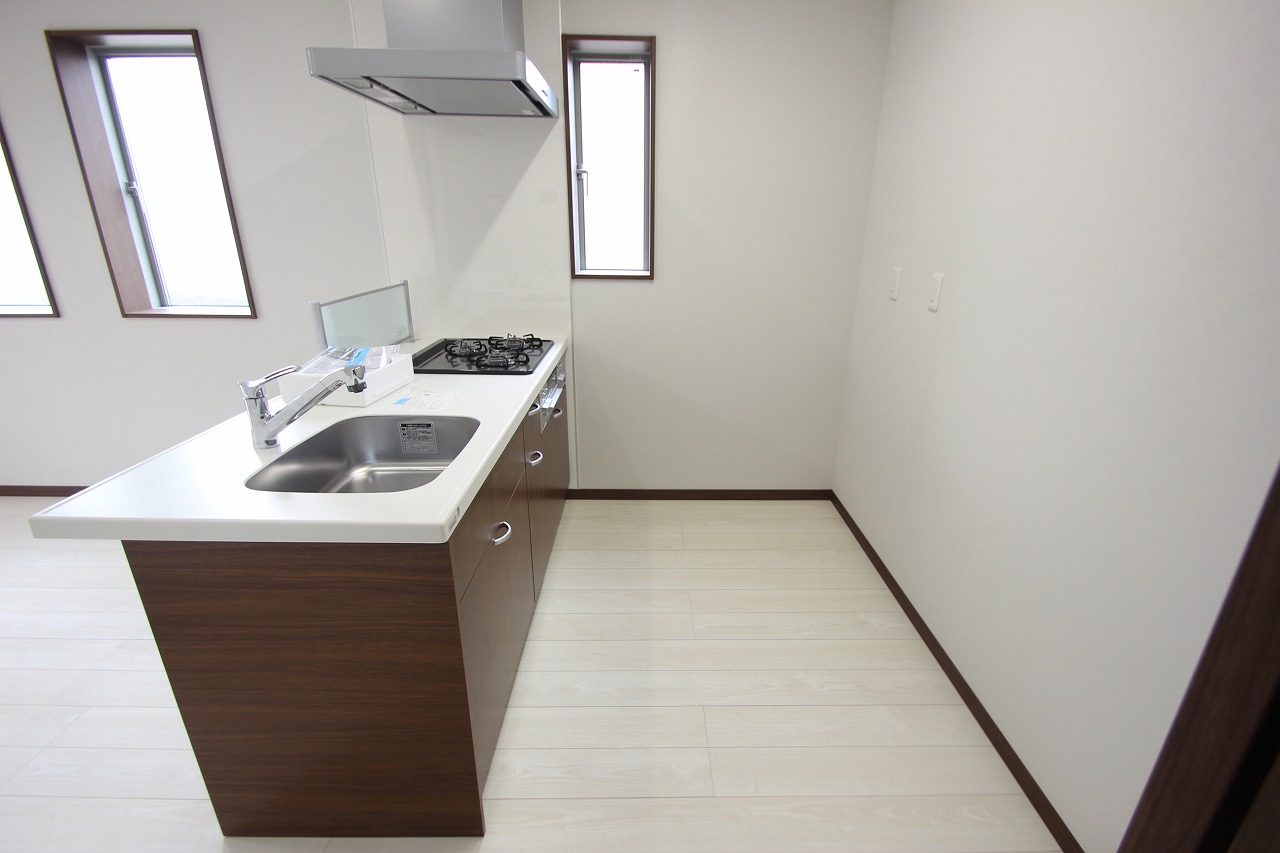 キッチンはカウンターキッチンタイプでガスコンロのシステムキッチンです