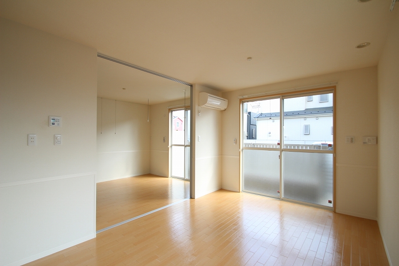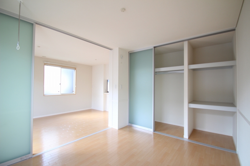洋室は収納量がたくさんあり、リビングとの間仕切りを開ければ広い一部屋としてお使いいただくことも可能でございます