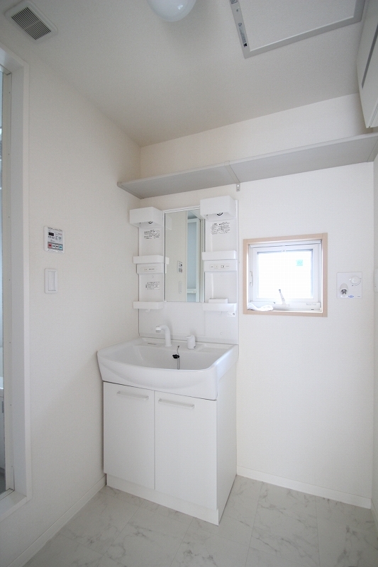 洗面所はこんな感じで広めの脱衣所にシャンプードレッサー仕様の独立洗面台がございます