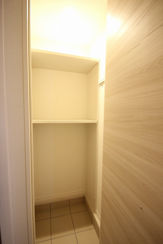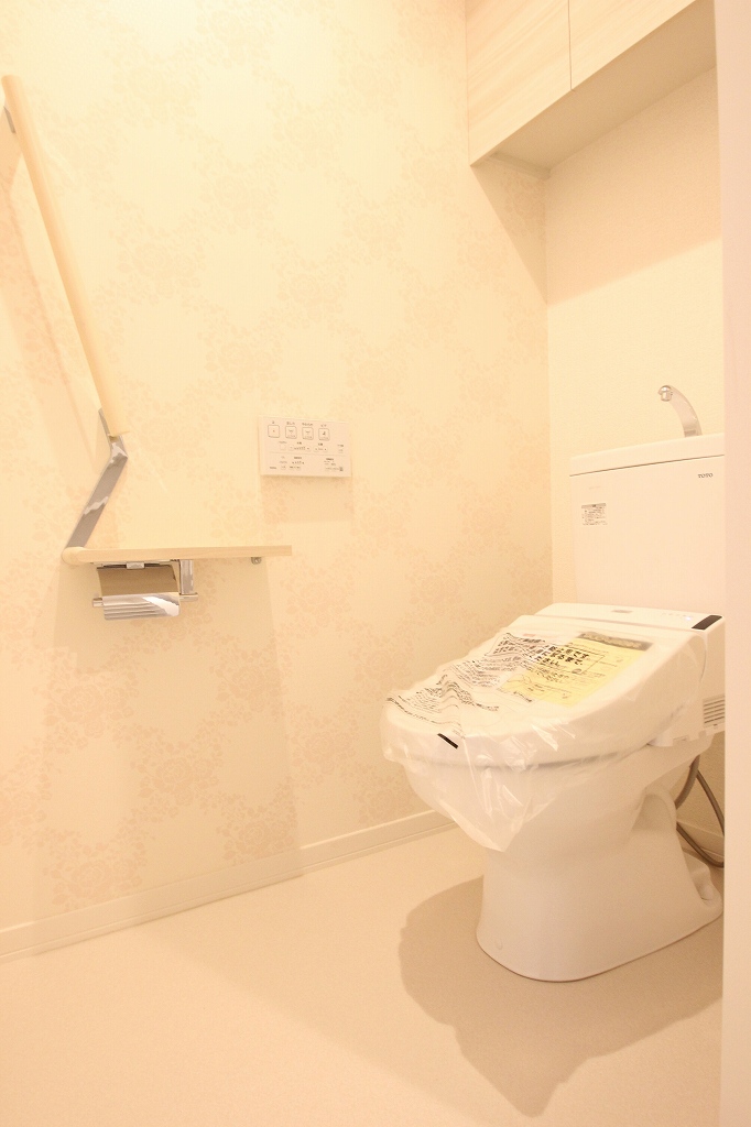 お手洗いも収納が付いており、ウォシュレットも壁面にパネルが付いているタイプなので使いやすそうですね