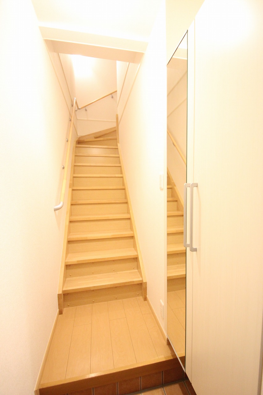 今回のお部屋は2階にございますので1階の玄関を開けるとまず階段がございます!。