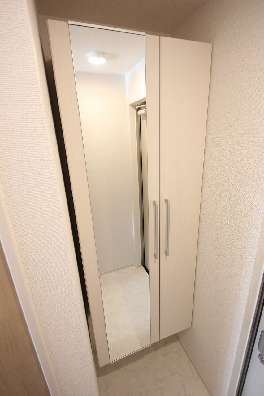 靴箱は鏡が付いており、一人では十分な大きさの靴箱となっております