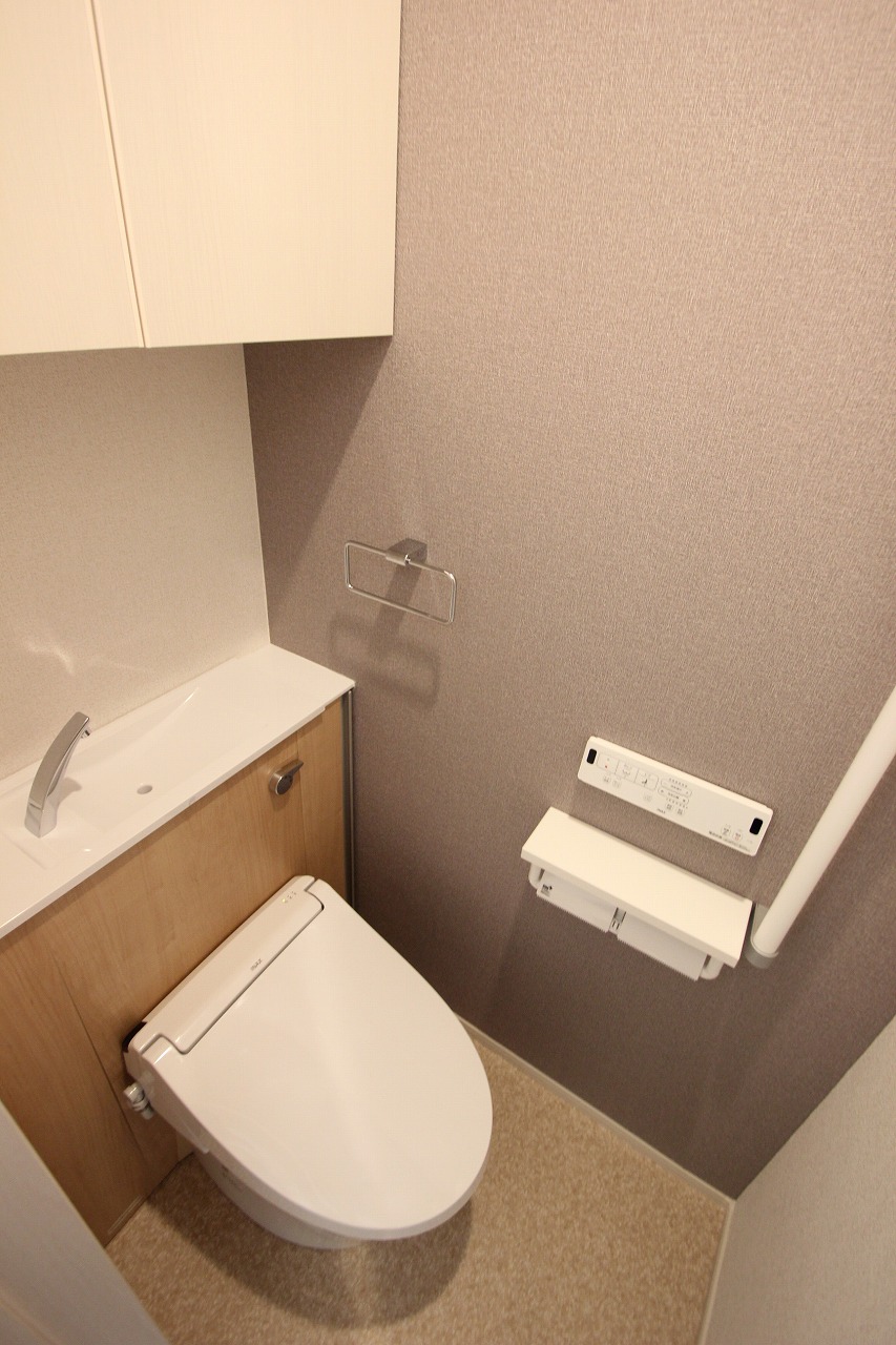 トイレはタンクが壁面収納されているタイプで設備されている収納もきちんとある仕様です