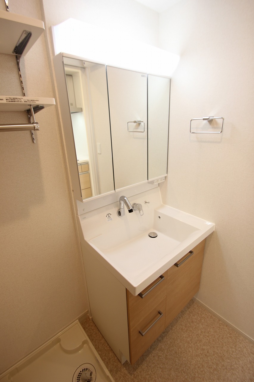洗面台は三面鏡のシャンプードレッサー仕様で忙しい朝には欠かせない設備となっております