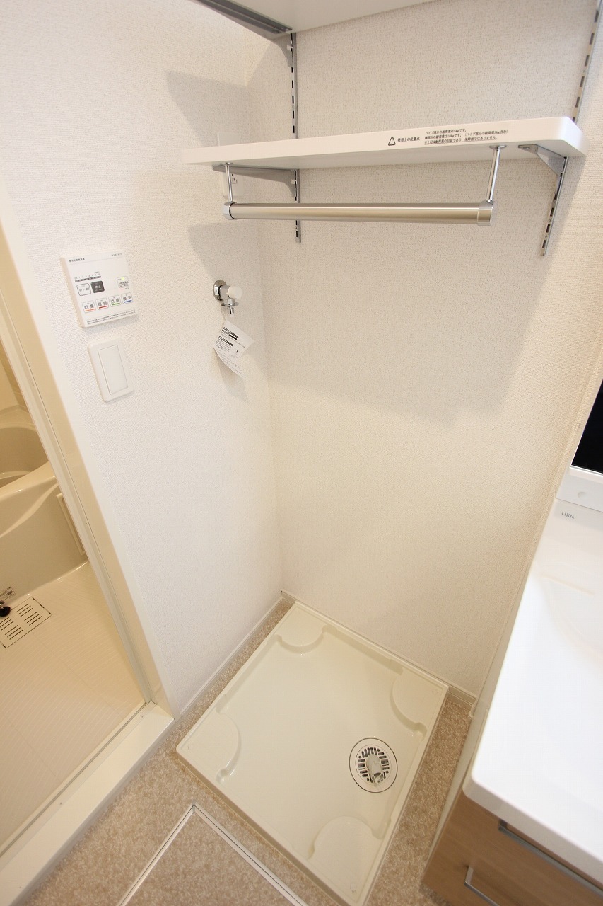 洗濯機置き場には壁付の棚がございますのでご用意いただく必要がないのは嬉しいポイントですね