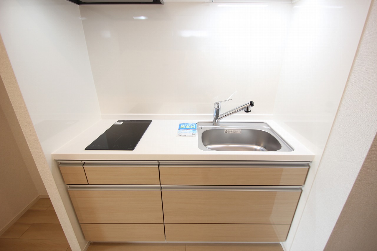 キッチンはこんな感じで2口のIHと調理スペースがありますので、お料理や自炊をされる方にもおススメですよ