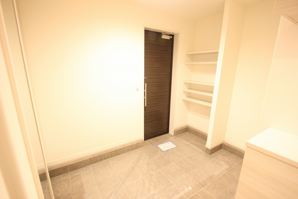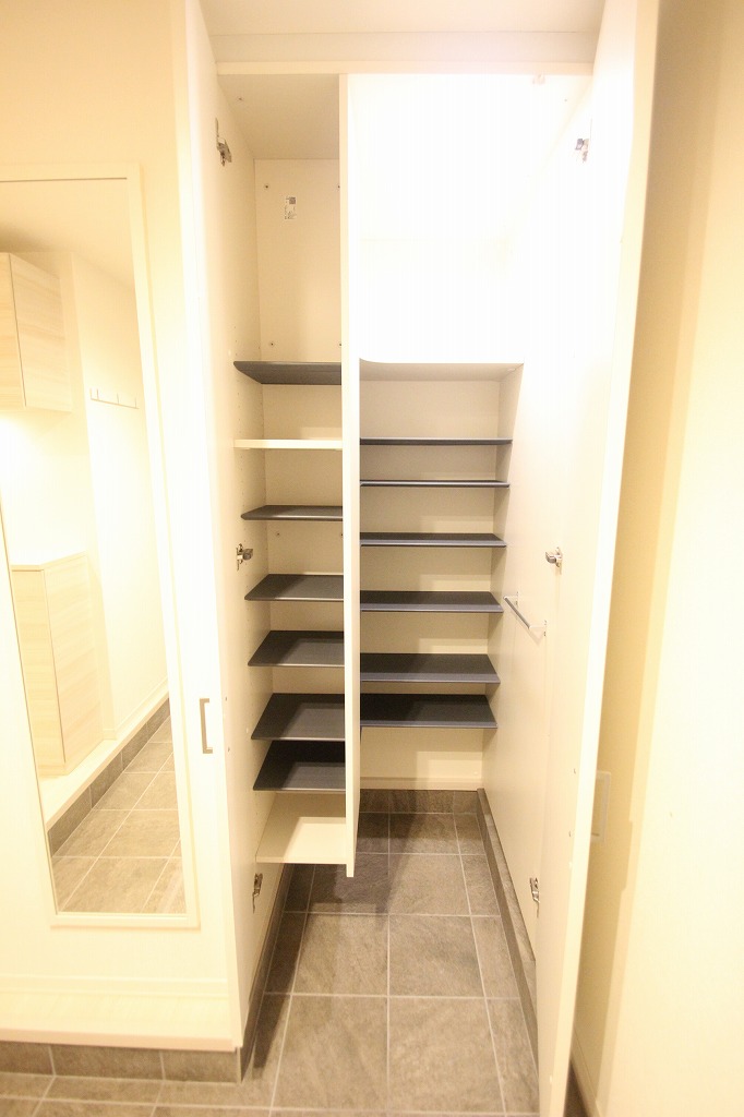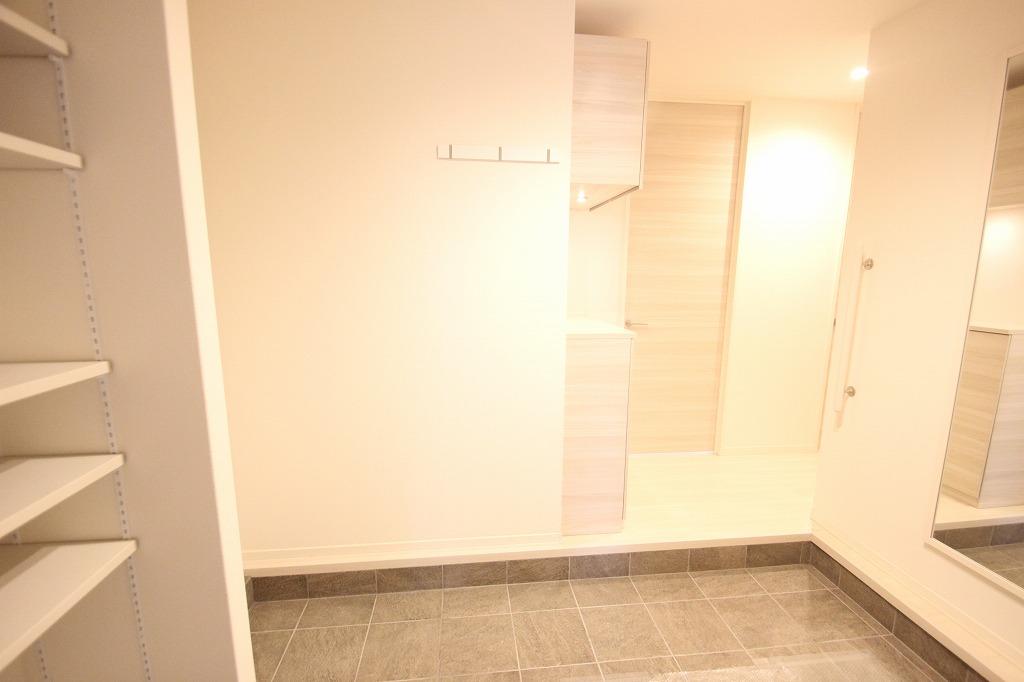 お部屋側から見てもわかる通り、シューズクローゼット以外にも収納や棚がございますので、使い方は自由自在です