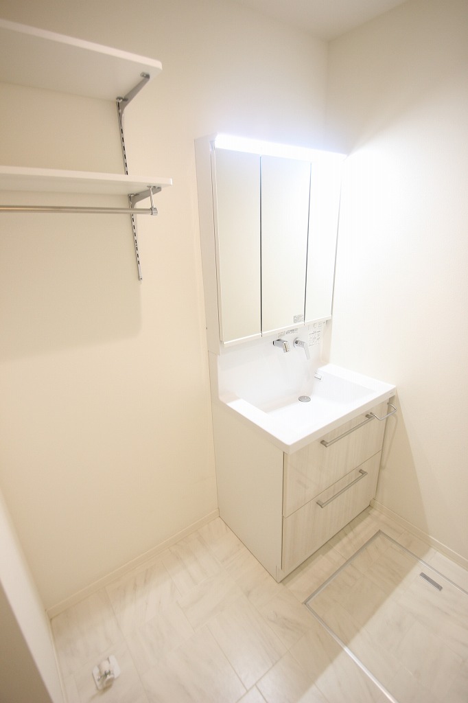 洗濯機置き場には壁付けの棚もございますので、用意が少なくて済むのは良い点ですね