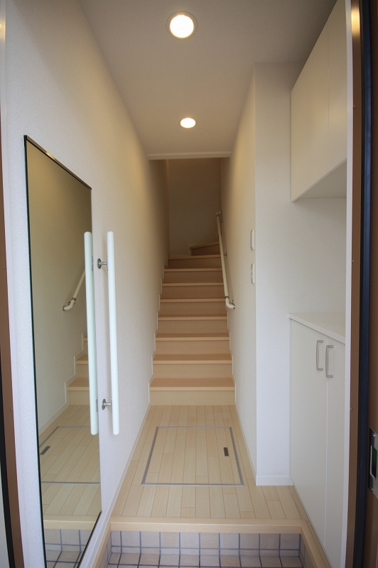 玄関扉を開けるとこんな感じで玄関部フロア部分には姿見やシューズボックスなど必須な設備がきちんとございます!