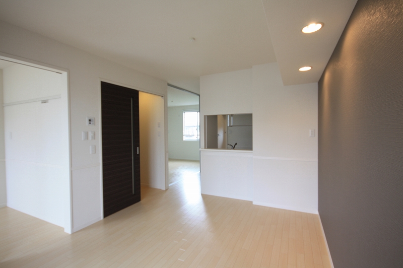 リビングはこんな感じでシックなデザインのアクセントクロスが入っており、おしゃれな雰囲気を醸し出しておりますね
