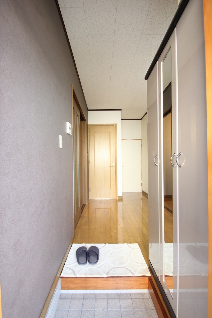 玄関を開けるとこんな感じでシックなアクセントクロスに加えて、大きめのシューズボックスが設備されております