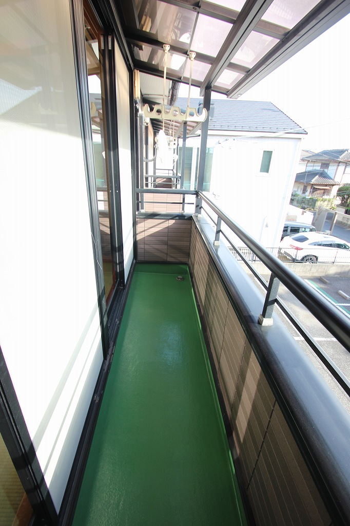バルコニーはこんな感じで幅もきちんとあり、屋根もあるのでお出かけ時に安心して干すことが可能です