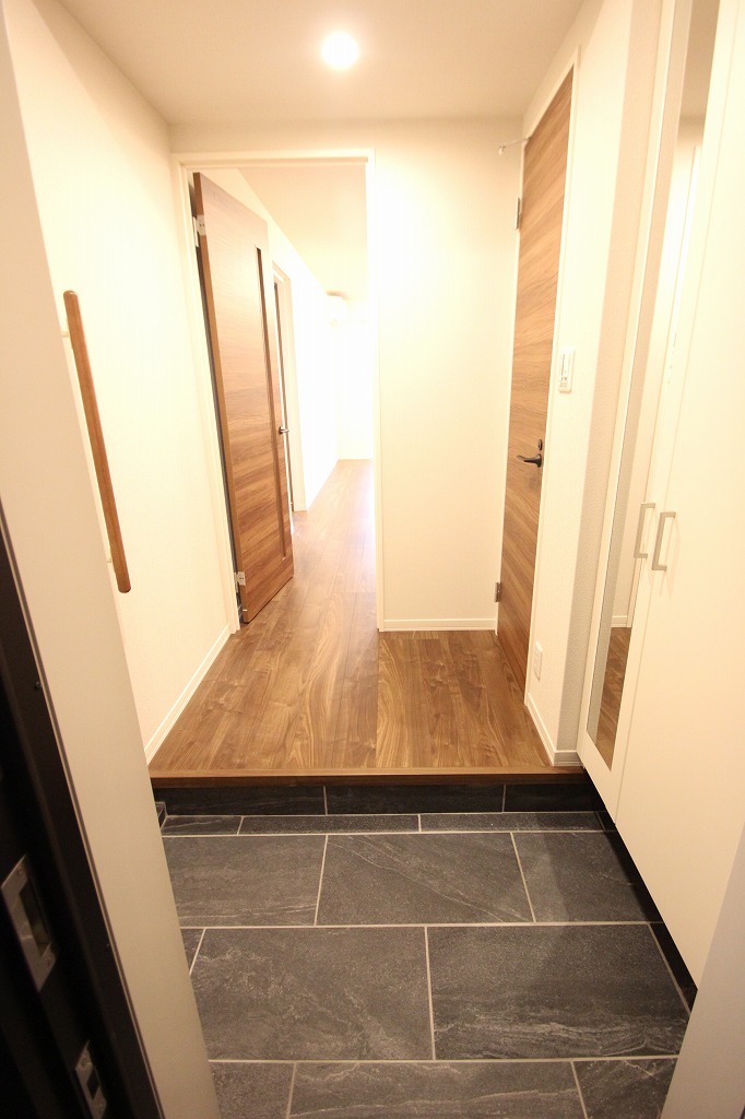 玄関を開けるとこんな感じで同建物内の他のお部屋に比べて広めの土間になっております