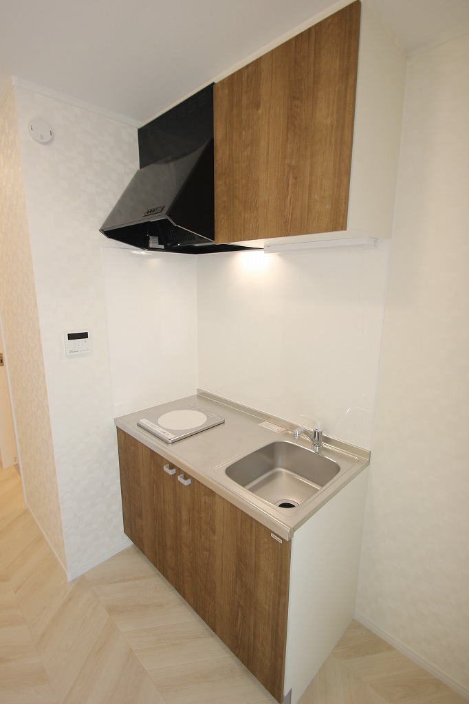 キッチンは一口のIHのコンロが付いたタイプではありますが、まな板を置くスペースもしっかりとありますので、自炊をされる方にもおススメできますね