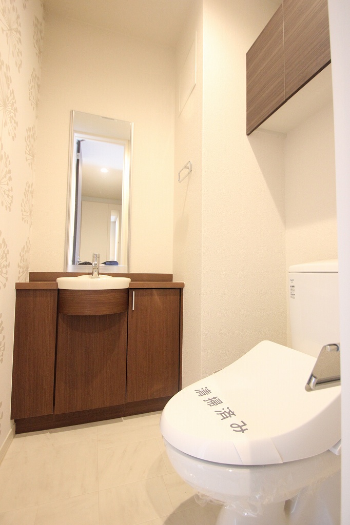 また、こちらはお手洗いなのですが、賃貸ではあまりない洗面台付きのタイプとなっております