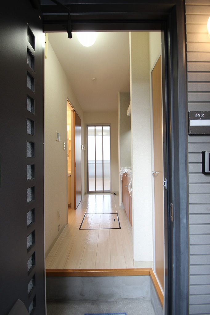 玄関はこんな感じで少し高めの段差があるため、埃やゴミなどが室内に入りづらい造りになっておりますね