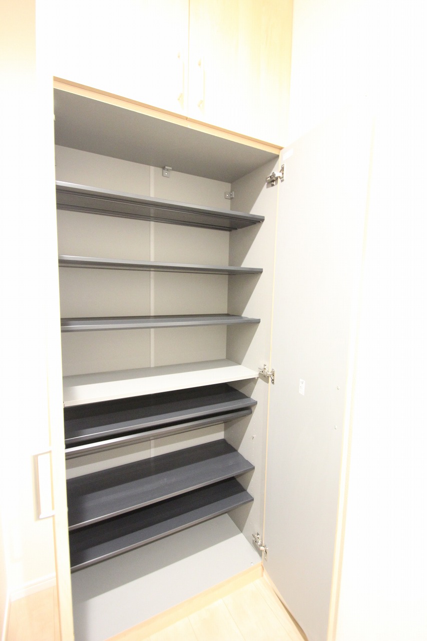 シューズボックス内部はこのように段をずらしたりすることのできる仕様になっておりますのでブーツなどのかかとの高い靴でもらくらくと収納できますよ