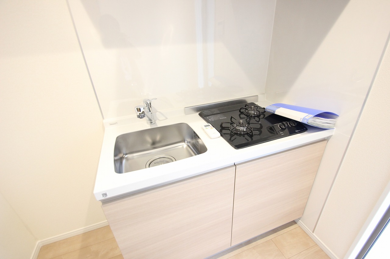 キッチンはこんな感じで何かと便利な二口コンロ付きのシステムキッチンです