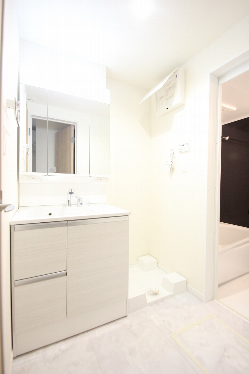 三面鏡仕様の独立洗面台は使い勝手に加えて、収納力抜群の設備となっております