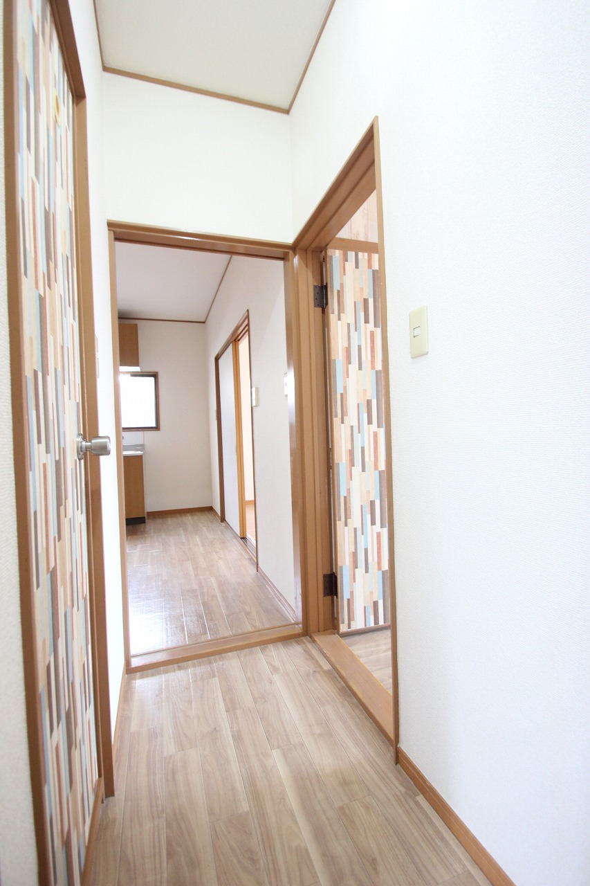 玄関を上がるとこんな感じで個性的な色合いの扉が見えますね
