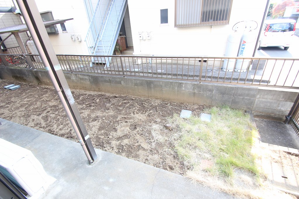 掃き出し窓の外はこんな感じで物干しとプランターなどを置くくらいのスペースはございます