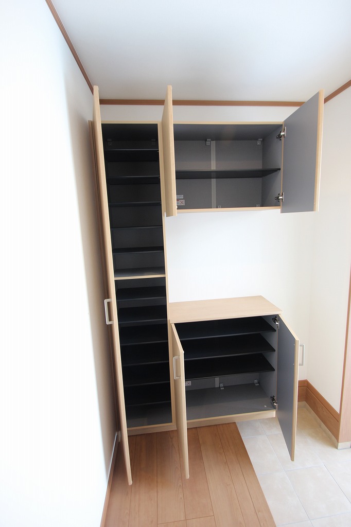 シューズボックスは可動棚のタイプでかかとの高い靴もらくらく入りますし、2枚目のクローゼットはお出かけ時の荷物や旅行鞄等を入れたりベビーカーを入れたりとあると何かと便利な玄関わき収納です