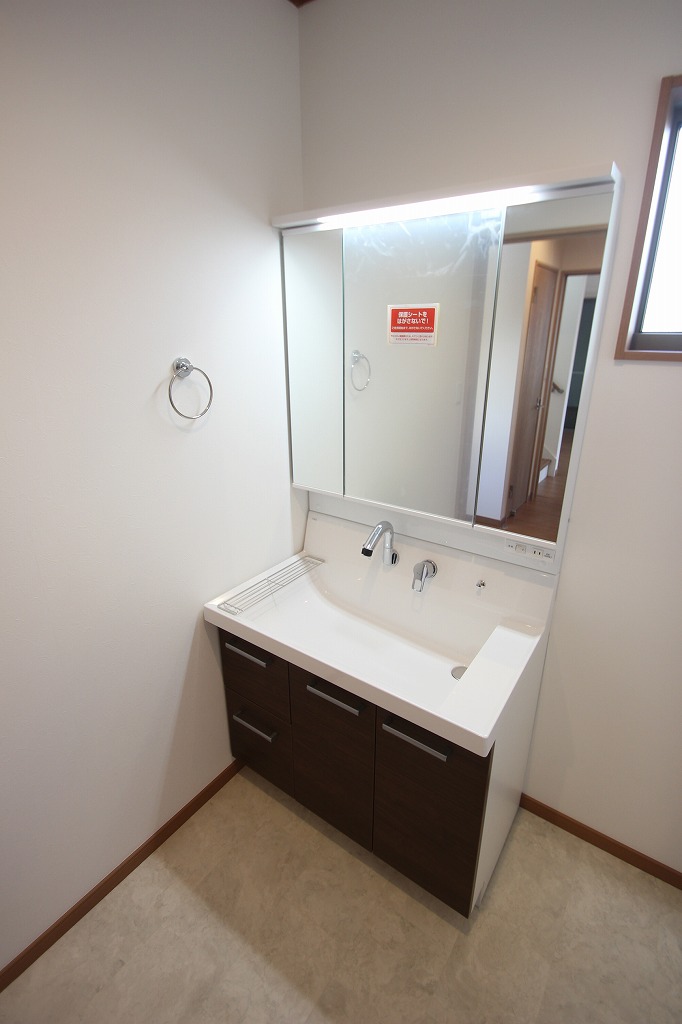 洗面台は三面鏡仕様の独立洗面台で玄関入ってすぐの位置にございますので帰ってすぐに手洗いうがいできますね