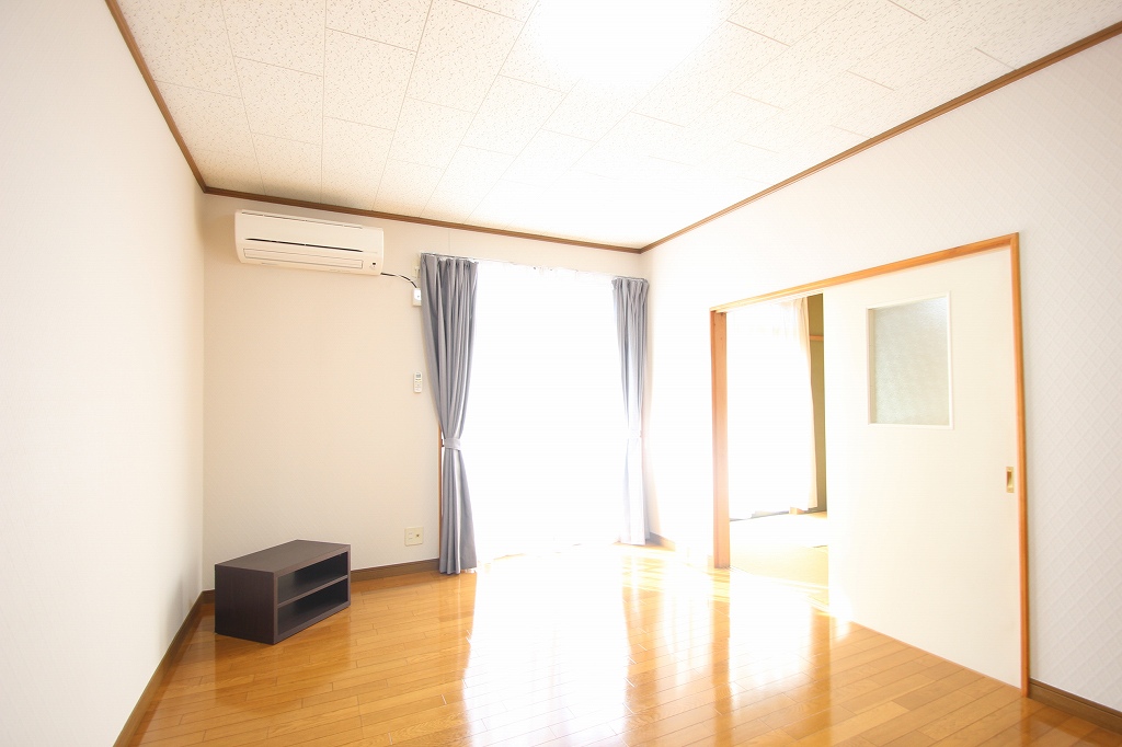 まずは洋室!フローリングで、家具の配置がしやすい形です。大きな窓からの日差しがたっぷり差し込み、とても明るいです。エアコンも付いているので、引っ越し時の初期費用が抑えられますね。