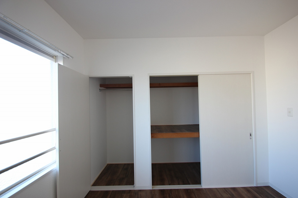 どちらの洋室にもしっかりとクローゼットが設けられています。特に広い洋室の方の収納は、ハンガーパイプと棚が分かれているタイプ!衣類だけでなく、かさばる荷物もスッキリ片付きます。