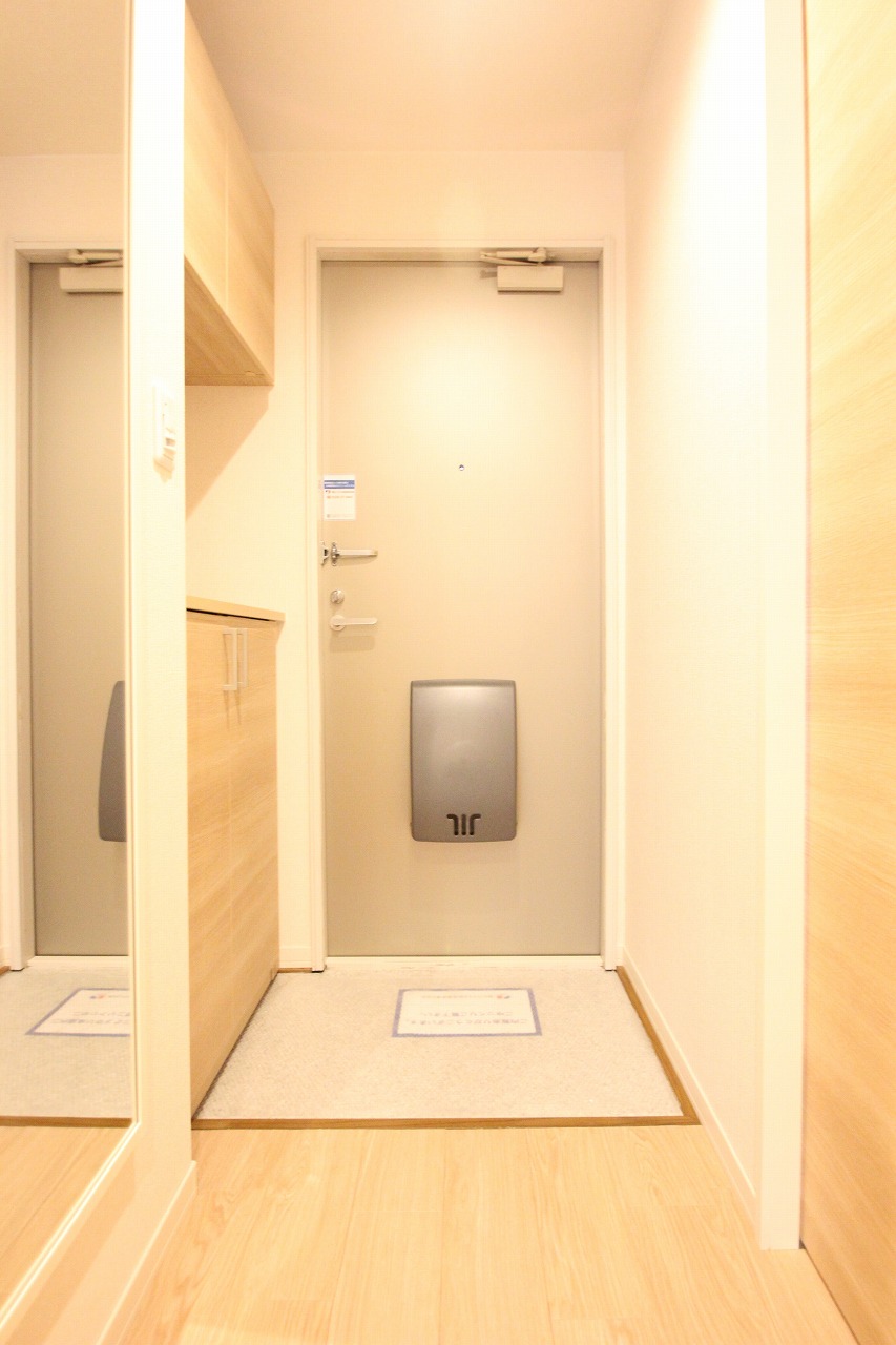 玄関には大きな姿見が設置されており、外出前のチェックが欠かせません。