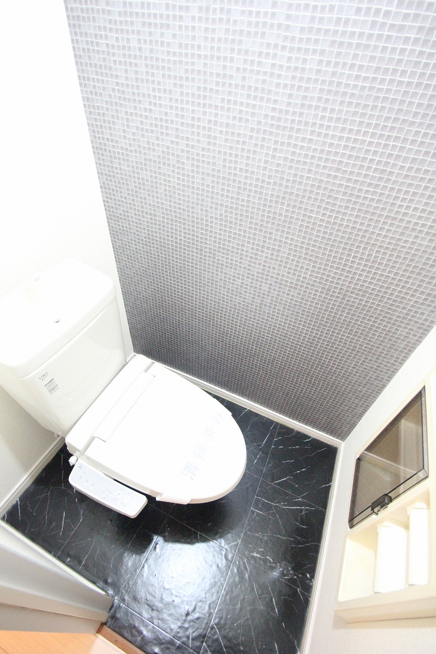 床の黒いタイルと、背面のおしゃれなアクセントクロスが効いていて、まるでホテルみたいにスタイリッシュなんです。