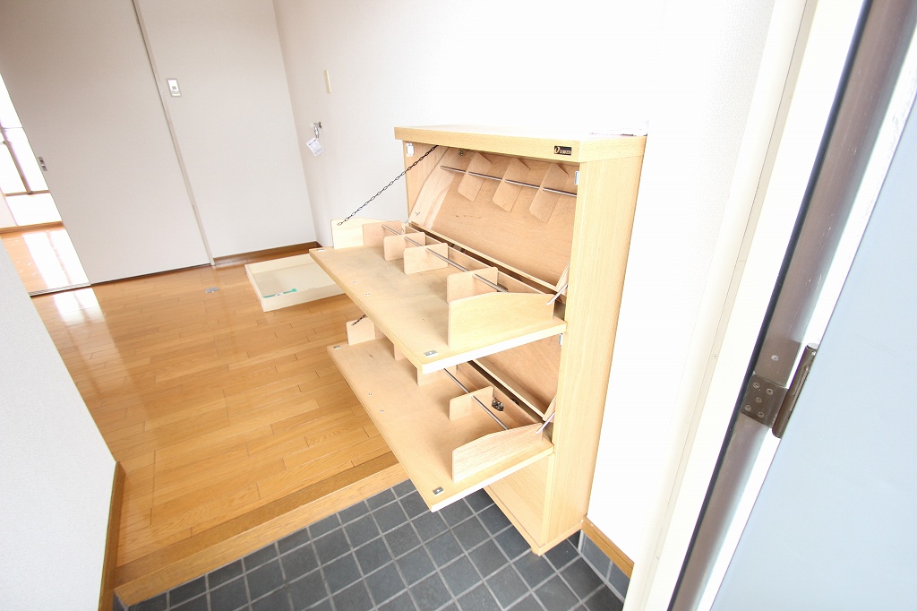玄関は清潔感があって、明るい雰囲気ですよね。右側には、こんなにしっかりとしたシューズボックスがあるんです!