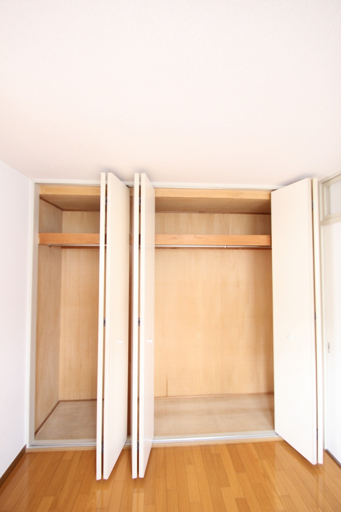 開くとこんな感じで、ハンガーパイプと棚があって、洋服も小物もたくさん収納できますよ。