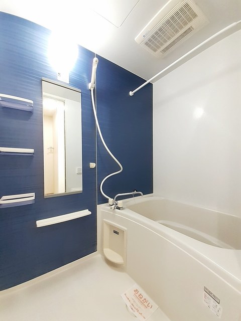 ネイビーの壁がとってもおしゃれで、まるでホテルのような雰囲気じゃないですか?湯船にゆっくり浸かって、リラックスタイムを満喫してくださいね。