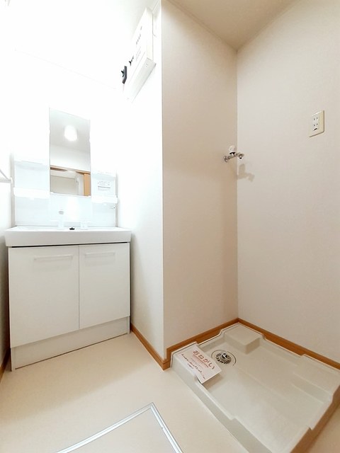 独立洗面台は朝の支度にも便利ですし、隣には室内洗濯機置き場があるので、家事動線もスムーズですよ。