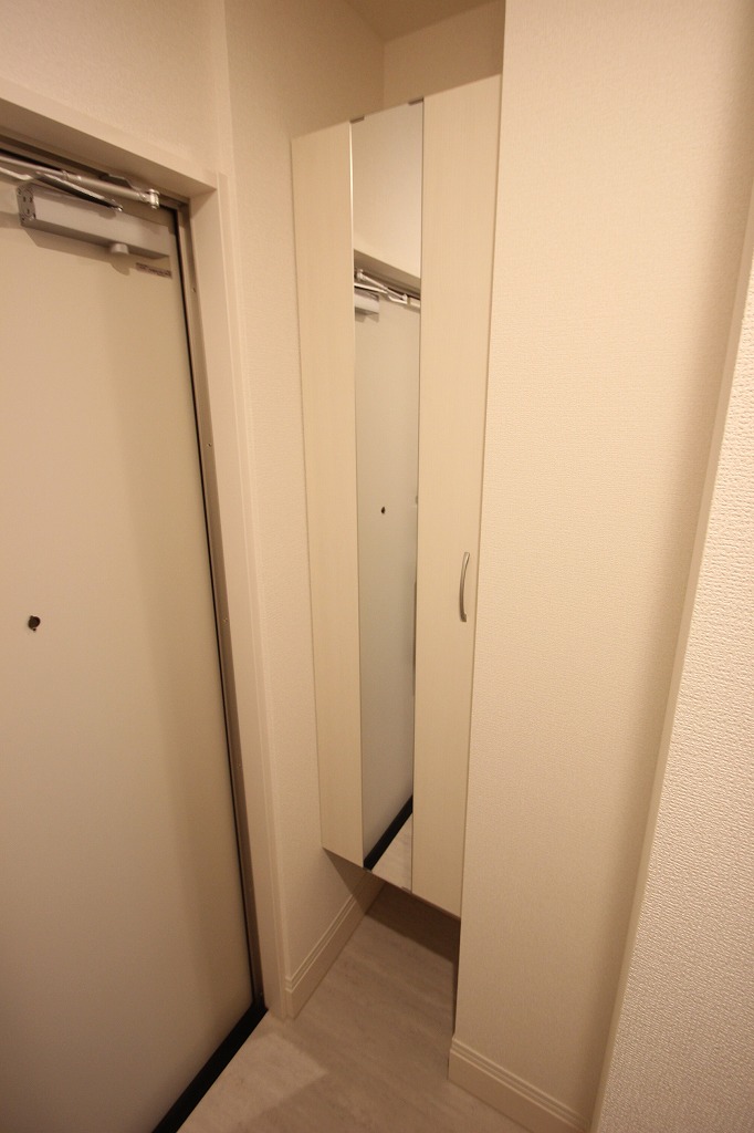 実はこれ、姿見付きのシューズボックスなんですよ!お出かけ前に全身チェックができるって、すごく便利ですよね。