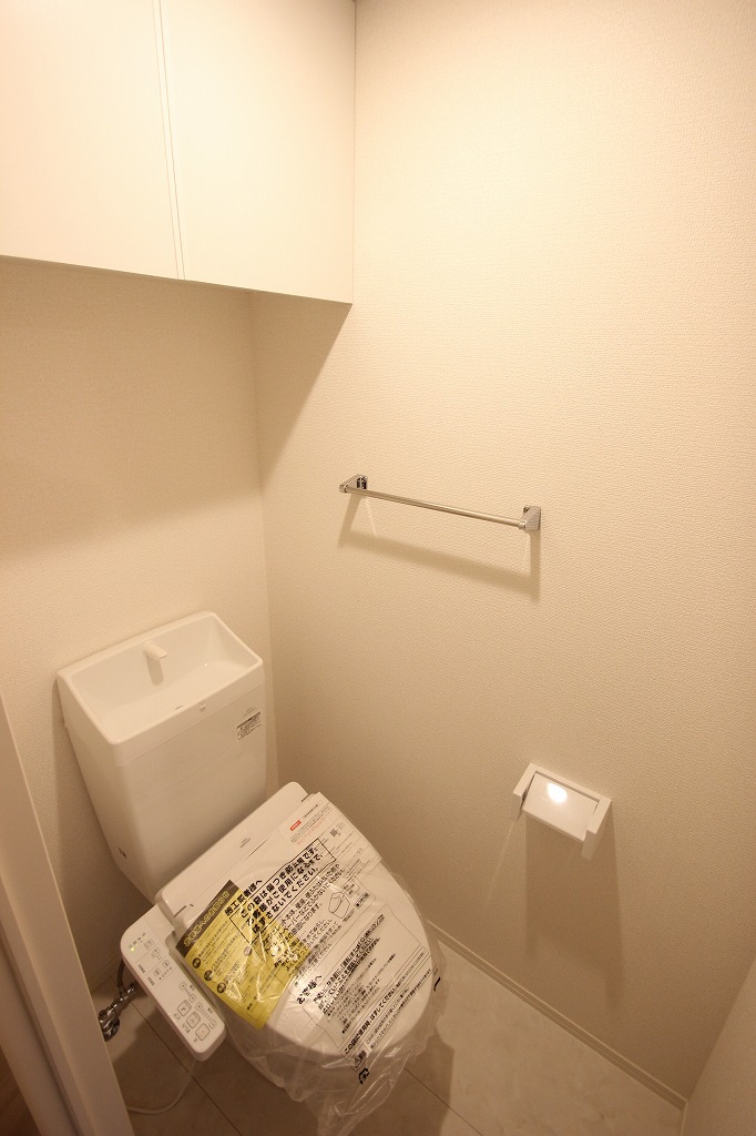 嬉しい吊戸棚付きで、トイレットペーパーのストックなども隠して収納できます。