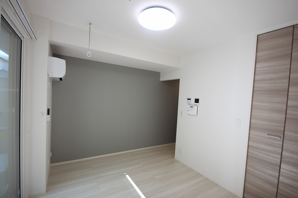 壁の一部には落ち着いたグレーのアクセントクロスが使われていて、空間がおしゃれに引き締まっています。