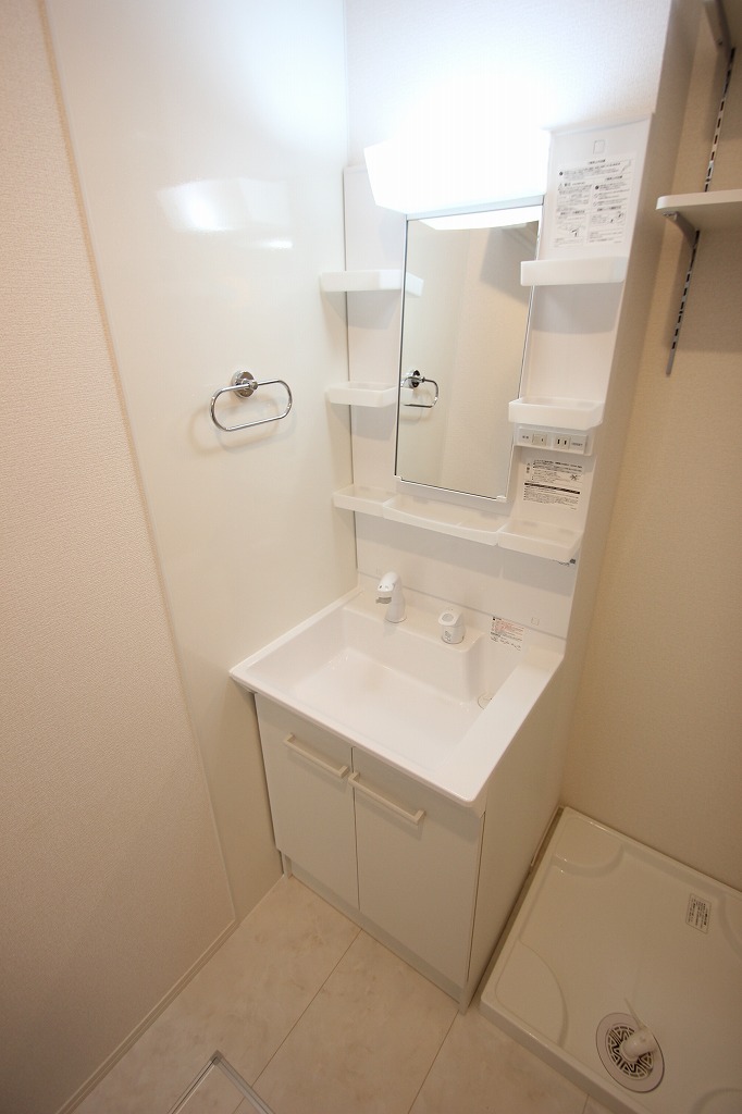 シャワー付き洗面台で朝の身支度もスムーズに!洗濯機置場の上には棚もあって、洗剤やタオルなどを置くのに便利なんです。