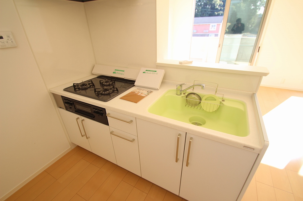 じゃーん!見てください、このシステムキッチン!清潔感のあるホワイトの中に、カラフルなライムグリーンのシンクが映えて、とってもおしゃれじゃないですか?!