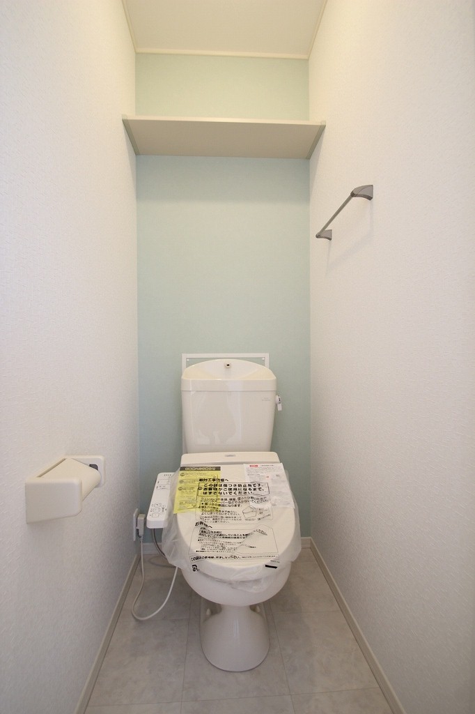 ここにも可愛い水色のクロスが使われていて、落ち着いた雰囲気なんです。棚もあるので、芳香剤を置いたり、ちょっとした収納にも便利ですよね。
