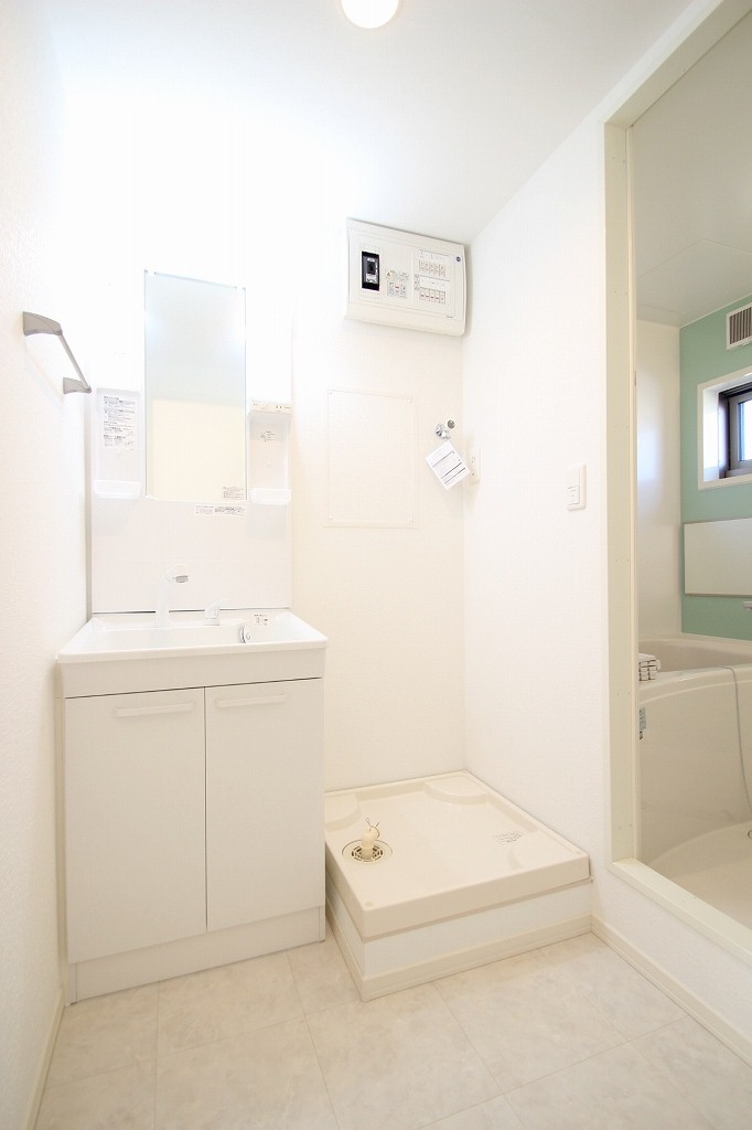 独立洗面台は忙しい朝の身支度に欠かせないですよね。隣には洗濯機置場もちゃんと確保されています。