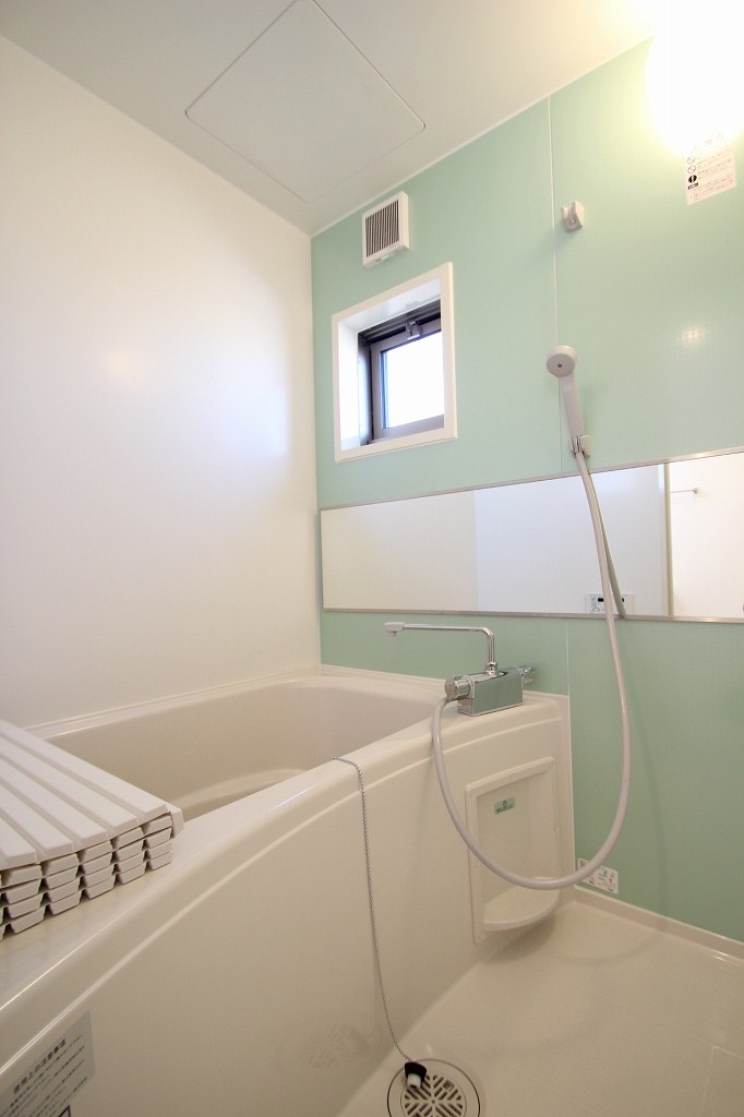 壁の一面が淡いミントグリーンで、とっても癒される空間になっています。ゆっくり湯船に浸かって、リラックスタイムを過ごしてくださいね。