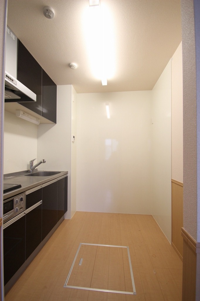 キッチンの奥には、冷蔵庫や食器棚を置くスペースもしっかり確保されています。