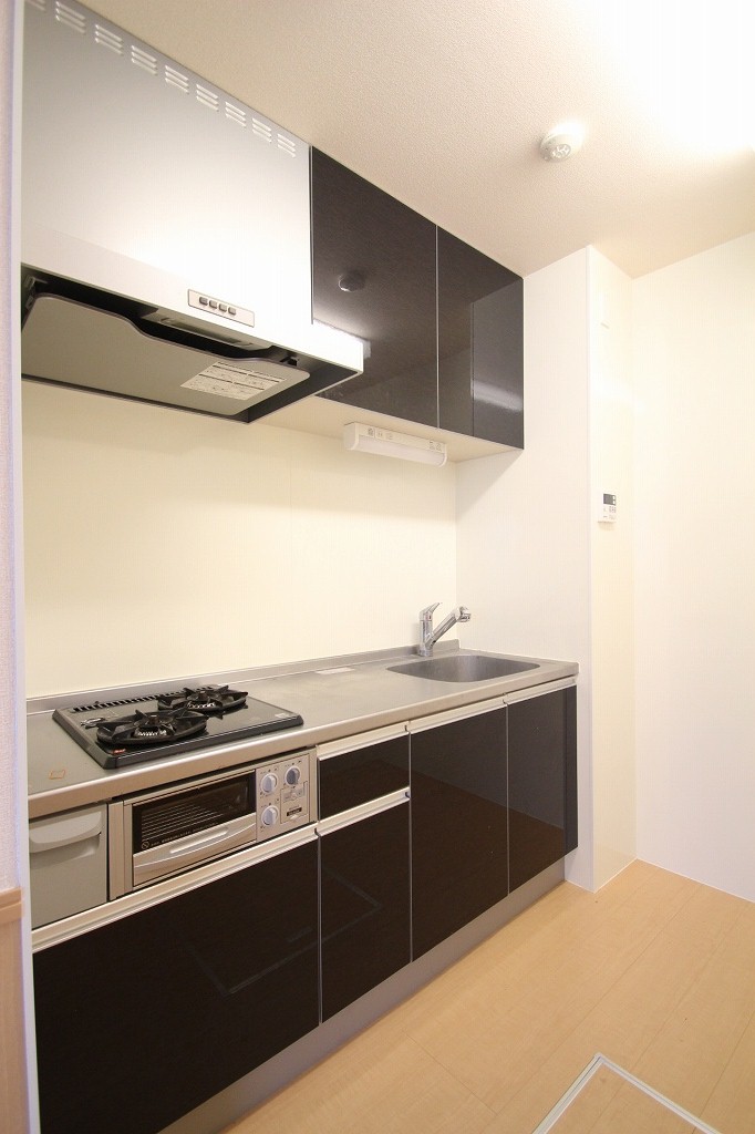 黒とシルバーで統一された、スタイリッシュなシステムキッチンです。3口ガスコンロでお料理のレパートリーも広がりそうですよね!都市ガスなので、光熱費も抑えられるのが嬉しいポイントなんです。