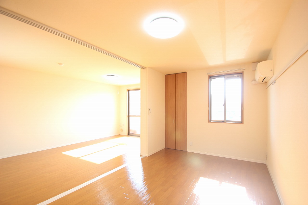 こちらは、リビングに隣接する洋室です。窓から光が差し込み、こちらも明るい空間。備え付けのエアコンも嬉しいポイントですよね!