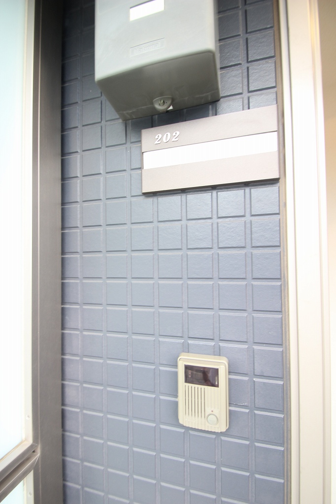そして、お部屋の入り口はこちらです!202号室のプレートが輝いていますよね。