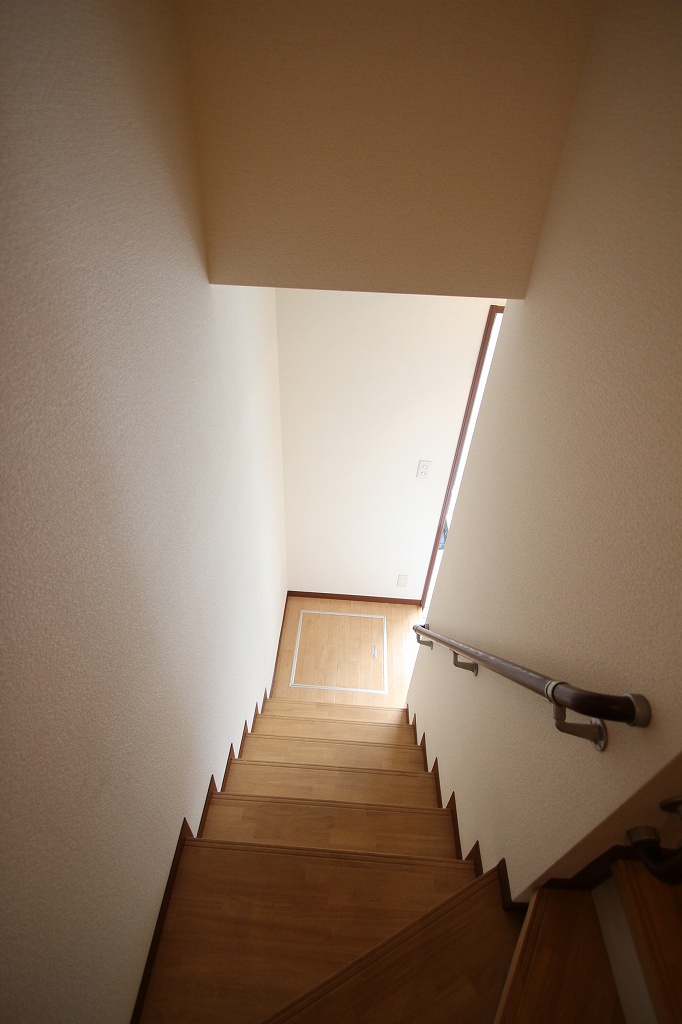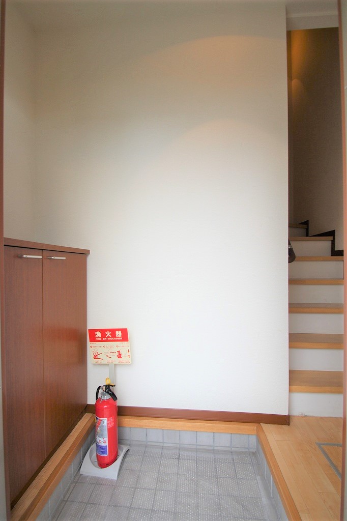 玄関を入ると、実は階段が!そう、こちらは上下階を使うメゾネットタイプなんです。まるで一戸建て感覚で暮らせるのが魅力ですよね。